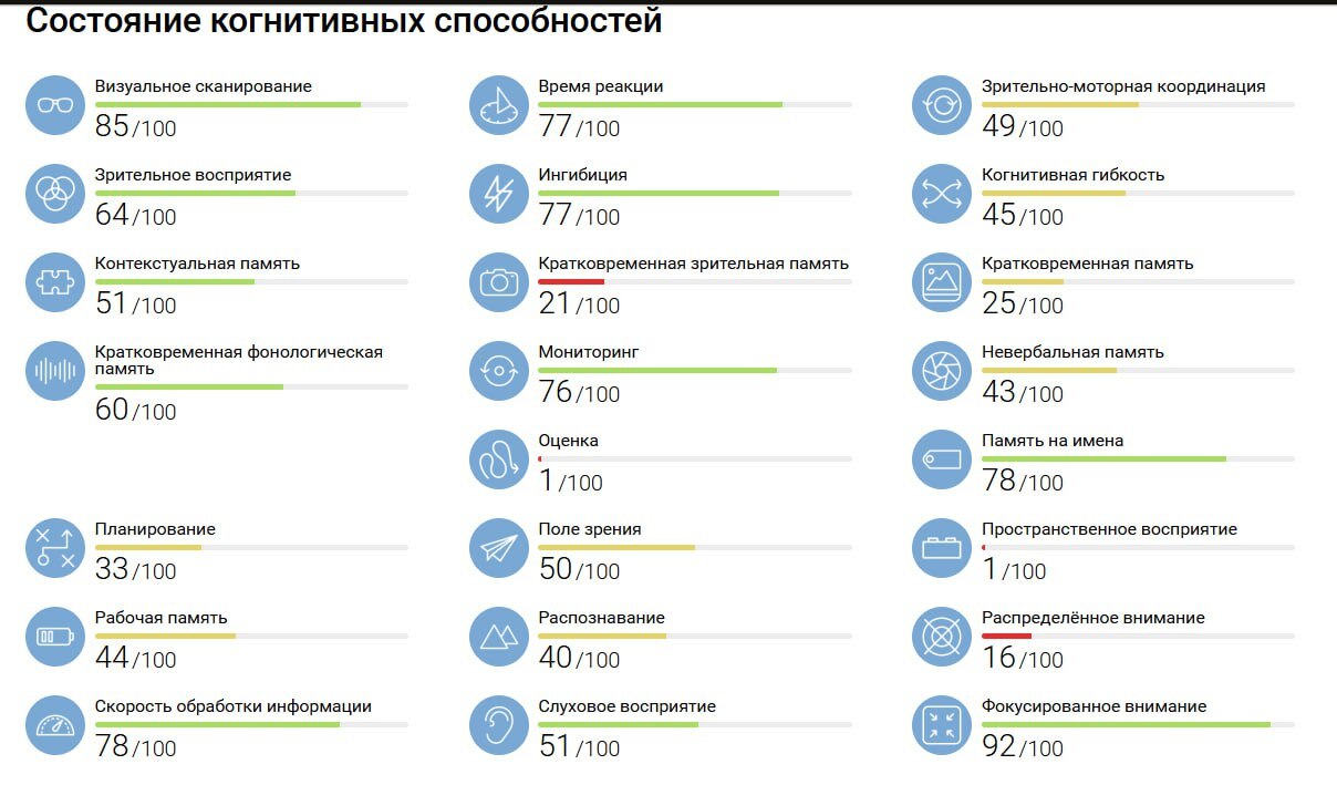 Нейросеть анализирует данные и формирует цифровую карту когнитивных способностей пациента по 24 параметрам — памяти, вниманию, концентрации и другим.