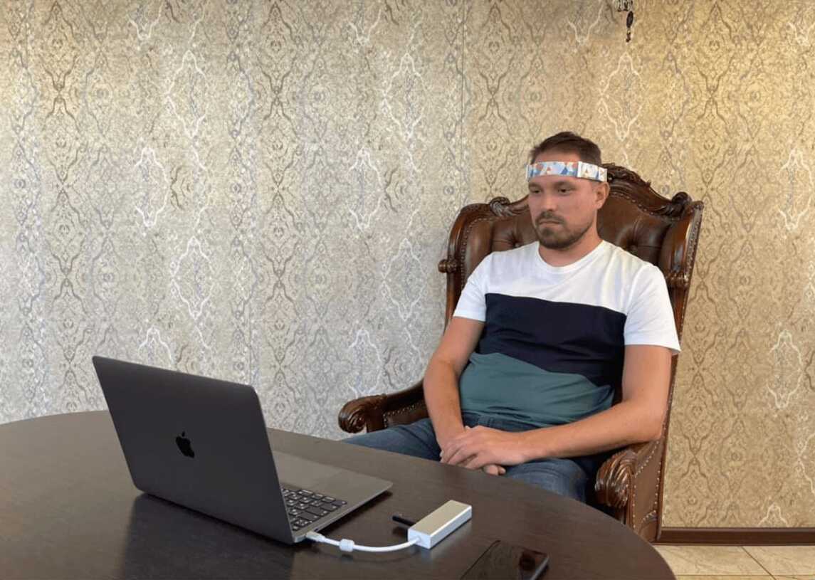 за компьютером у нас в кабинете. На голову надевается лёгкий датчик, который считывает активность мозга.